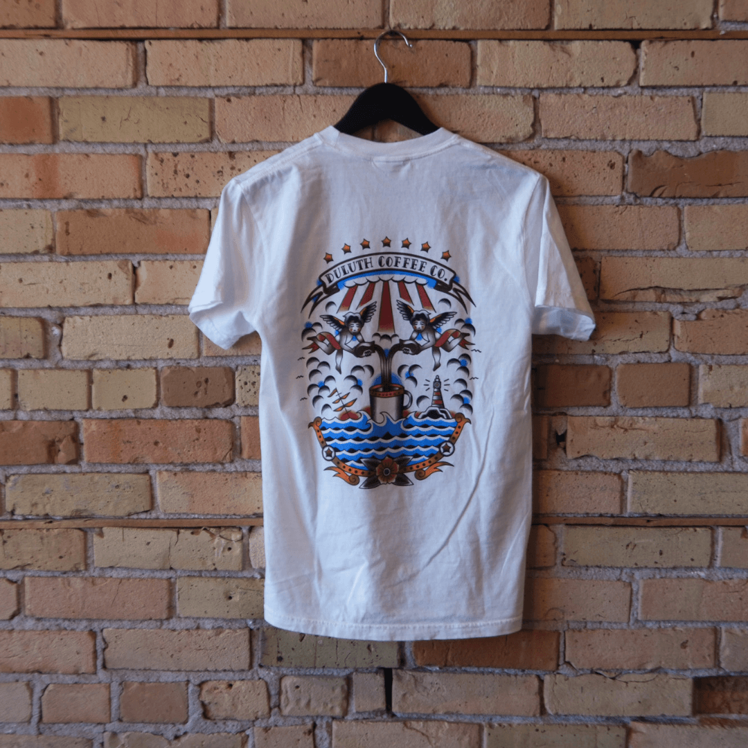 A quality, medium weight white t-shirt printed with a custom full color americana design from a local tattoo legend, Joe Remark. Printed locally with five color gradients- ink badge on the front left chest, and full print on the back.